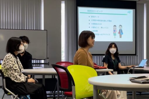 説明会では、現役大学院生による体験談を聞くことができる座談会も開催されました。座談会では、3人の大学院生が、研究テーマや大学院生の一日、受験予定者へのアドバイス等を話してくれました。参加者は、先輩たちが話す大学院生生活について、興味深そうに聞き入っていました。現役大学院生は、参加者からの熱心な質問に、楽しいことや大変なこと等の経験を織り交ぜながら答えていました。