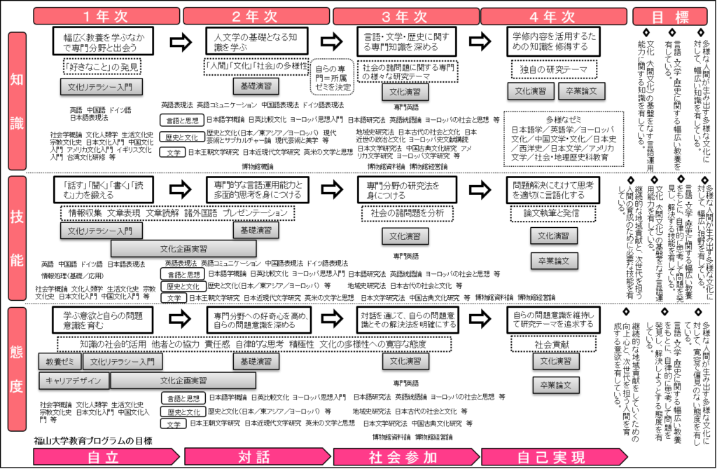 共通基礎科目と教養教育科目,及び専門基礎科目(人間文化学部共通科目)と専門科目を通じて,学びの目的を知り,言語運用能力と実践力の基礎を身に付ける。