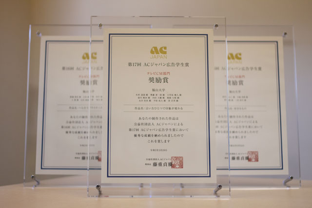 第19回ACジャパンCM学生賞の新聞広告部門で優秀賞、テレビCM部門で奨励賞を受賞しました。