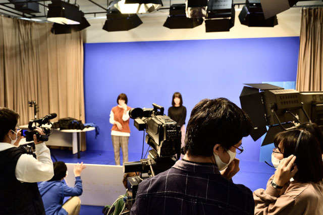 メディア・映像学科では、照明や防音設備の整った、本格的な撮影スタジオを準備しており、映像制作の演習で活用しています。この撮影スタジオには、壁面及び床を青一色にしたコーナーがあり、クロマキー合成用の映像撮影も可能となっています。