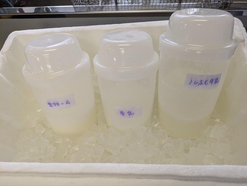 今回の実習では生クリーム、牛乳、ノンホモ牛乳の3種類をシェイカーに入れ、ひたすら振って、バターを作りました。