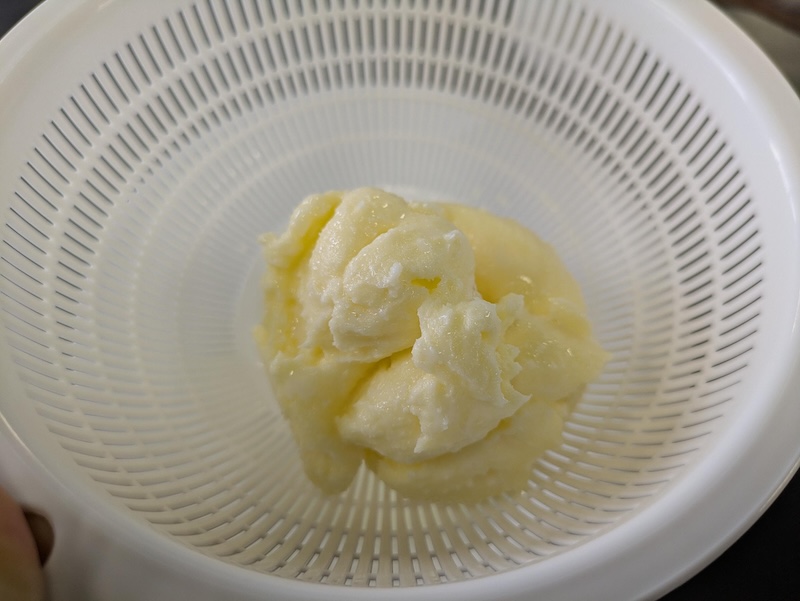 シェイカーから取り出し、バター(固体)とバターミルク(液体)に分離させ、どのくらいの量のバターができたかを計量しました。