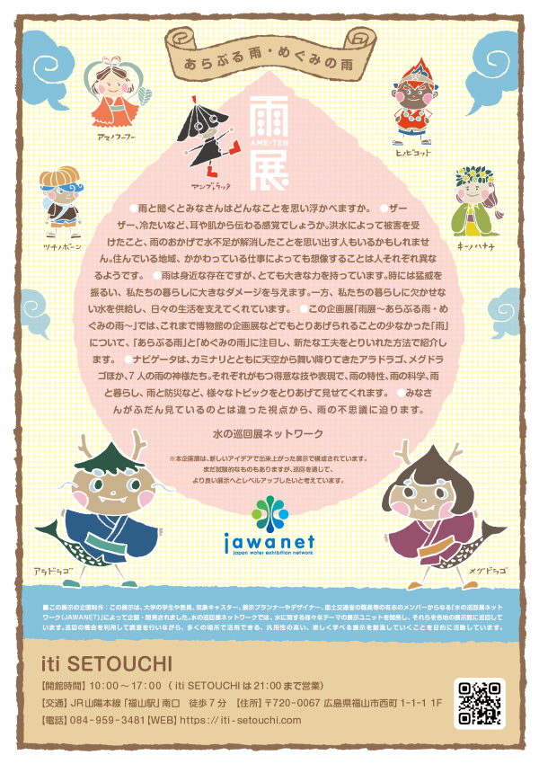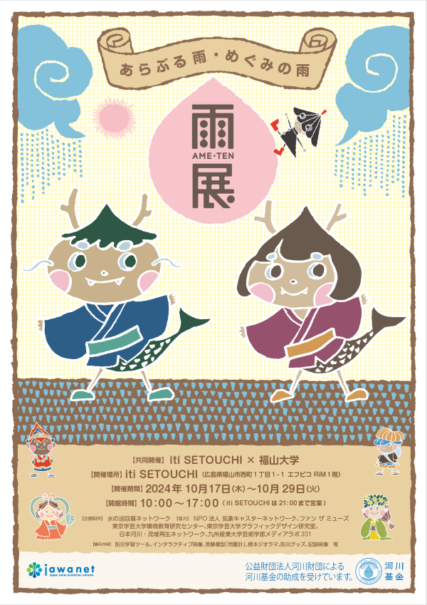 海洋生物科学科4年生の学生が、福山市内のパブリックスペースiti SETOUCHI で、雨を題材にした体験型展示「雨展」を開催します。