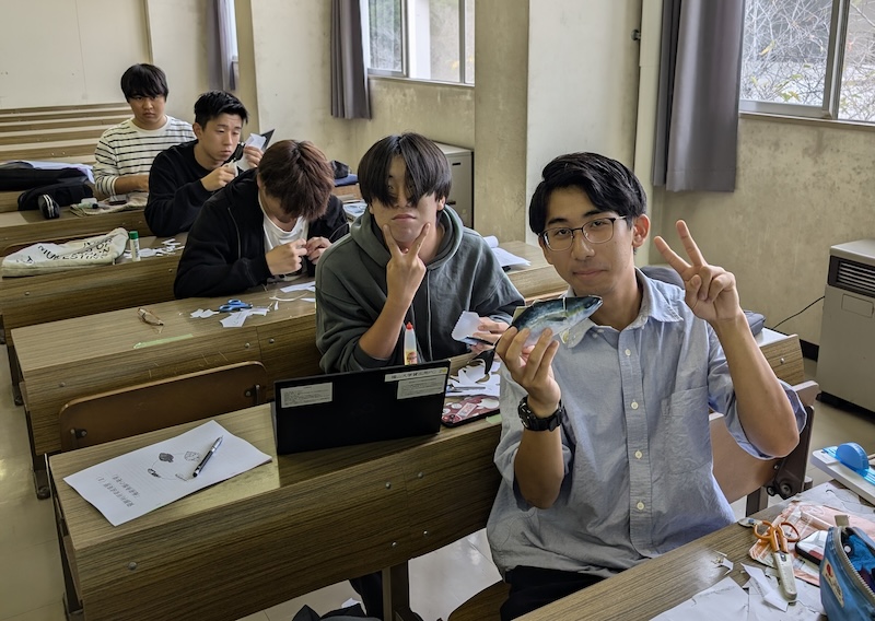 初日は実習の説明を受けた後、ブリの成魚のペーパークラフトを各自で作成し、大人のブリ(成魚)の形態をよく観察します。