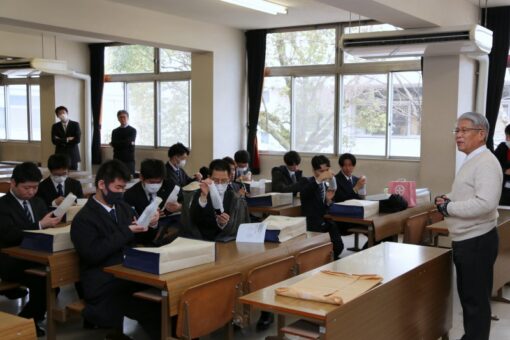 学位記授与式が終わったあとは17号館に移動して、1721教室で学位記の授与ほかを行います。生物科学科は学生実習でワインの醸造を行いますので、自分の作ったワインを卒業記念として持ち帰ります。今日は醸造長の吉﨑准教授が不在だったので、山本覚教授がワインの飲み方などについて説明しました。