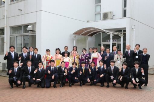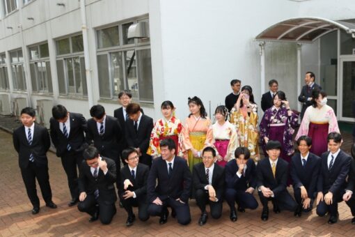最後に岩本学科長の簡単な挨拶と、4年前の入学時を振り返る短い動画を観ました。この動画は、前日、急遽学科長が思いついて作ったもので、結構うけたと思います。その後玄関前に移動し、集合写真を撮りましたボロボロボロボロですが、卒業生はキラキラです。社会に出ても、ぜひ活躍してください。また、たまには大学にも遊びに来て下さい。