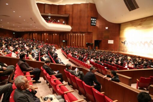 大学会館ホールの中に入ると、1階席はほぼ学生さんで満員でした(手前は教員席)。2階席は吹奏楽団とご家族の方々ほか。