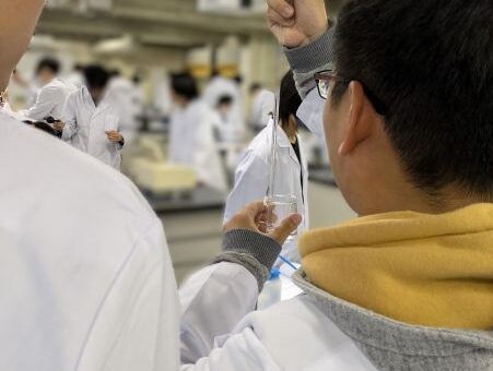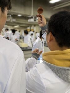 ポリフェノールを発色させ吸光度測定へ。濃度が薄い方から濃い方にだんだんと色が濃くなっていると操作が上手くいっているはずです。途中で間違いに気づき、やり直す班もいましたが、どの班も協力して頑張っていました。