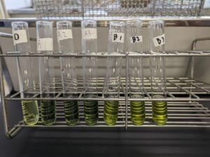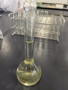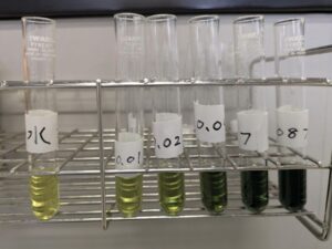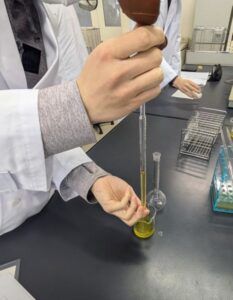 まず、基準となる検量線を1日目に作成します。分量の表を見て間違いがないようにメスピペットを使用して溶液を試験管に入れ、希釈していきました。