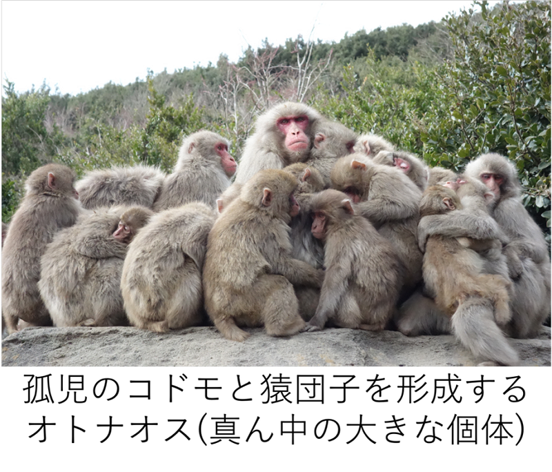 私は2021年に小豆島でオスを一頭ずつ追跡し、毛づくろいや非敵対的な密着などの親和行動を観察記録しました。分析の結果、乱婚型の交尾からはある意味予想通り、オスは自身の子に対して親和的に振る舞うわけではありませんでした。一方で興味深いことに、オスは母親を失った孤児のコドモに対して高い親和性を示すことがわかりました。孤児はもっとも重要な庇護者である母親の喪失を補填すべくオトナオスの周りに集まるため、親和行動を受ける機会が多くなると考えられます(下の写真)。
