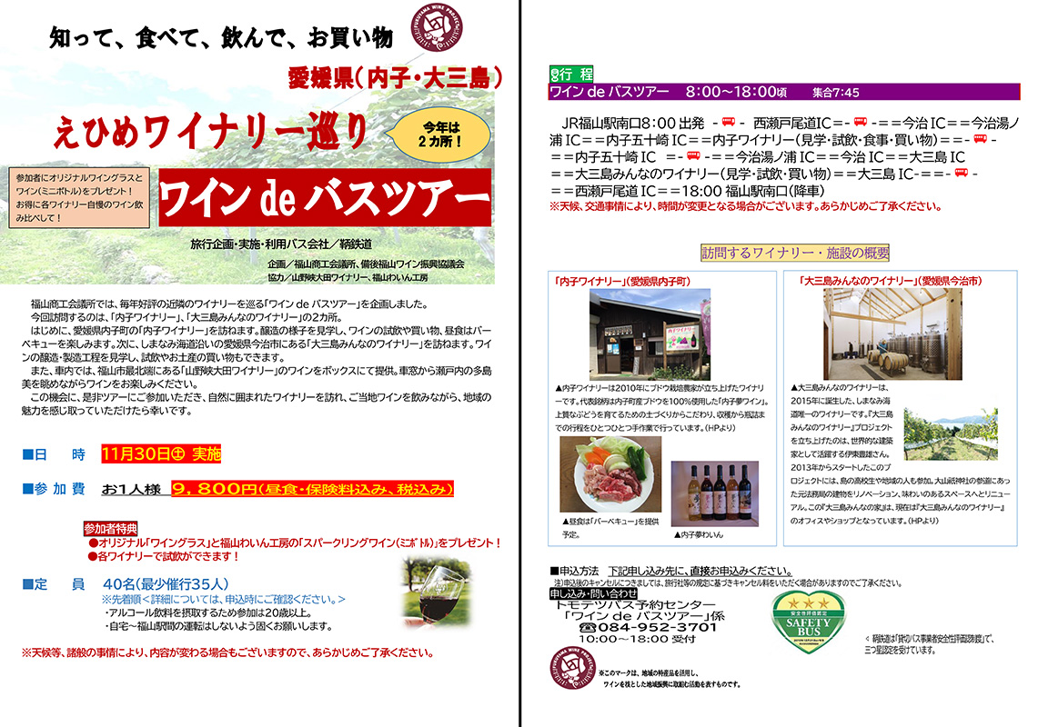 例年企画しているバスツアーは今年度は愛媛県の内子ワイナリーと大三島みんなのワイナリーの2ワイナリーを訪れました。醸造技術者から造りのポイントなどを聞いたり、醸造所やぶどう畑を見学する体験型観光ツアーで、今回も申込多数により開始早々に締め切りました。