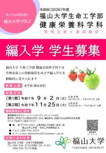 2025.05.28 【健康栄養科学科】令和8年度編入学生募集について 令和8年度編入学生募集について、募集要項を公開しています。 令和8(2026)年度 生命工学部編入学試験 健康栄養科学科 募集要項 2026年度募集 編入学生(A4ちらし) この記事をシェアする