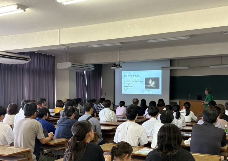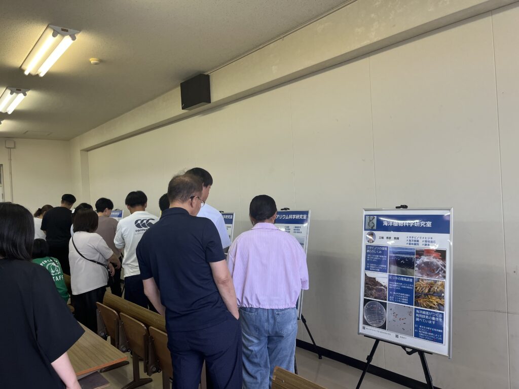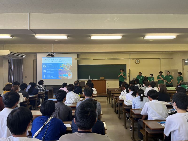 最初は北口教授と4年生による学科紹介です。海洋生物科学科では、3年生から「資源利用育成コース」「フィールド生態環境コース」「アクアリウム科学コース」「水産食品科学コース」の4つのコースに分かれます。各コースの特徴や、卒業後の進路などを紹介しました。