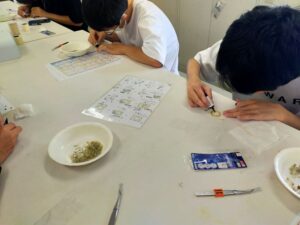 ちりめんじゃこに混じったイワシ以外の生物をチリメンモンスター(チリモン)と呼び、タコやイカ、エビ、アジや太刀魚など、様々な種類の生物がいます。今回の実習では、チリモンを紫外線硬化樹脂(レジン)を用いて標本にして、水族館に展示するパネルを作成しました。