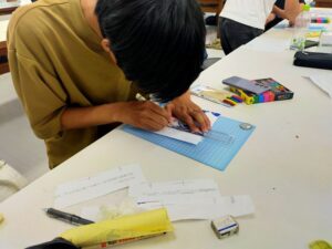 標本のチリモンがどのような生物なのか調べ、用紙に表現しました。デザインしたものをハリパネに貼って4辺をカットし、最後にチリモンの標本を貼り付けました。