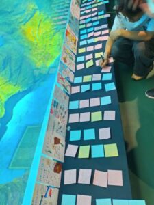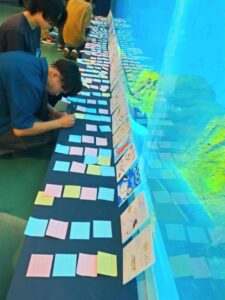 出来上がった作品を水族館の大水槽前に並べて展示会を行い、お互いに評価しました。