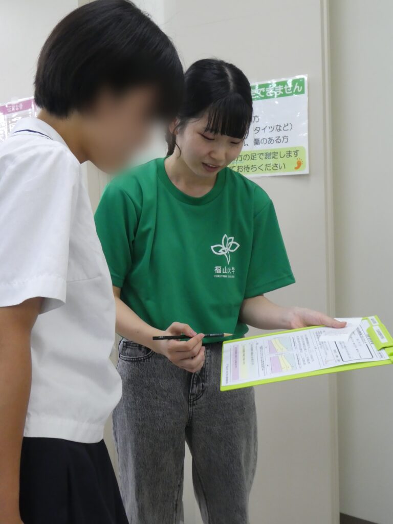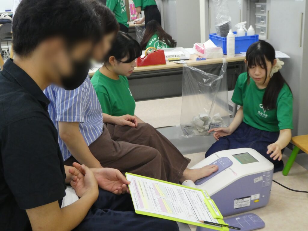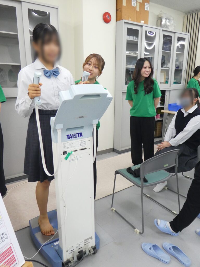 授業や実習で実際に使用する「体組成測定機」という機械を使って、体脂肪率や筋肉量の測定や、「骨密度測定」では手作りの解説シートにデータの記入をし、結果の確認や骨を丈夫にする食習慣などの解説を行いました。