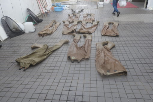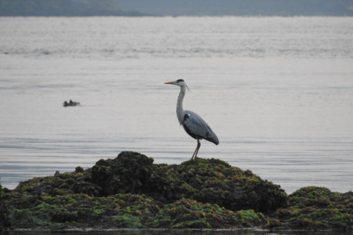 今月の大潮に当たる日の干潮時間、朝6時にキャンパスに集合しました。今日は、4年生から3年生への引継ぎということで、比較的多い人数での調査となりました。眠い目をこすりながら胴長を履き、たも網等の生物採集用具を持っていざ海辺へ。海では人のいない静かな朝を過ごしていたアオサギなどの鳥たちが迎えてくれました。
