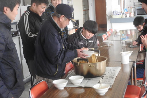調査後はキャンパスに戻り、食堂でキムチ鍋うどん。寒い中での調査だったのでとてもおいしかったです。朝ごはんを食べていない学生がほとんだったようで、すぐになくなりました。
