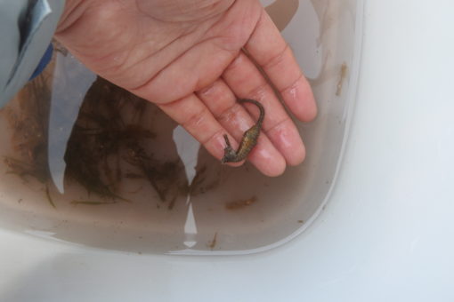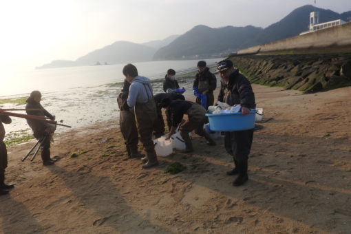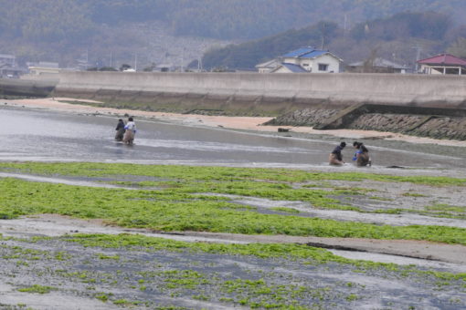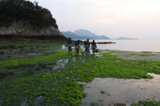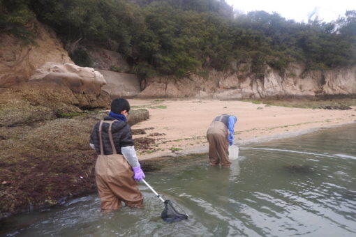 因島キャンパスのすぐ目の前には、生物多様性豊かな沿岸域が広がっています。どのようなメカニズムでこの生物多様性が維持されているのかと、とても興味深く思いました。その面白さは実際に目で見なければ実感できないことではないかと思います。今回、南研究室の調査に参加させていただき、胴長を履いて、たも網持って、生き物を捕まえて、採集の楽しさを実感したと共に、一人でも多くの皆さんにこういう環境があるのだと教えたくなりました。南教授、学生の皆さん、ありがとうございました。