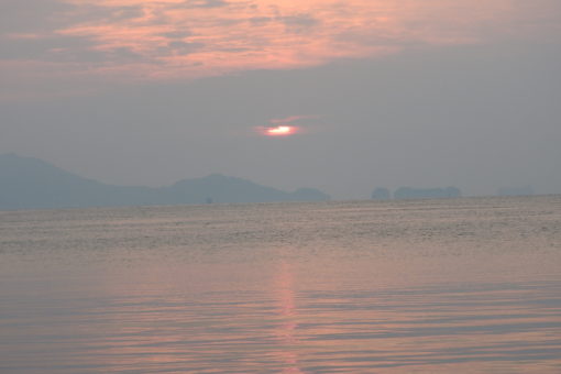 ガラモ場班とアマモ場班に分かれ、沿岸域に生息する魚類、甲殻類等の動物の採集を行いました。今日は曇りでしたが、因島大浜からの朝日はとても綺麗で、良い雰囲気を醸し出しておりました。こんな環境で調査ができるのはうらやましいですね。晴れた日は本当に感動的です。