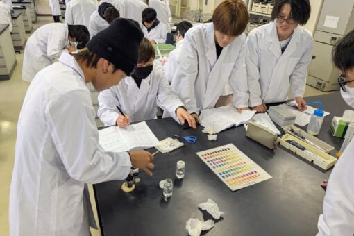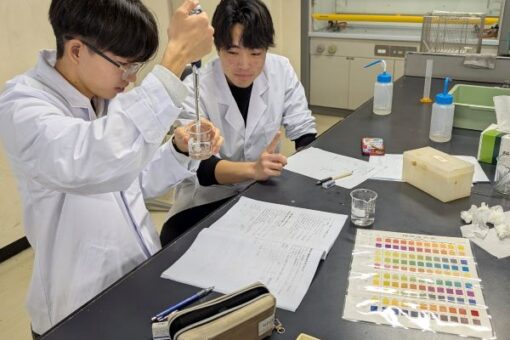 1年生対象の海洋基礎実験は担当教員が交代しながら様々な基礎的な実習を行っています。今回は「酸と塩基・pH」の実習の様子を報告します。