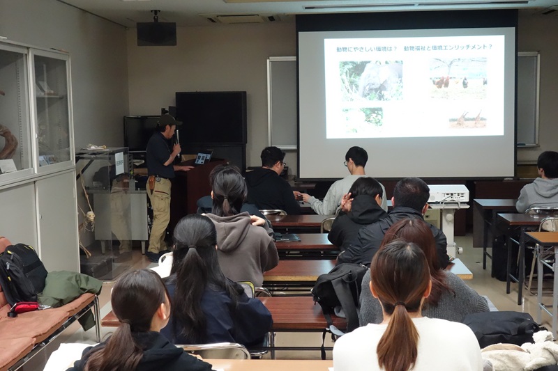 今回の実習では、学芸員である萩原慎太郎先生に特別講義をいただきました。動物園は私たちが楽しむための場であるだけでなく、環境教育や調査研究、希少種の保全など、社会にとって不可欠な様々な役割を担っています。そのためには動物に対して適切な福祉を施した上で飼育することが求められるものの、現実的には難しい場合も多々あります。日本の動物園が直面している課題やスタッフの方たちの試行錯誤の実態について聞くことができ、学生たちにとってはとても実践的な学びになった様子でした。講演後に出た活発な質問がそれを裏付けていました。