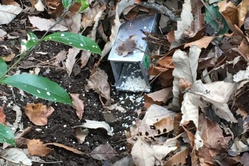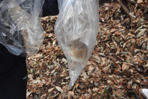 サンプリングを行った後は捕獲場所でアカネズミを放します。勢いよく森に帰っていきました。また捕まるなよー。達者でな―。
