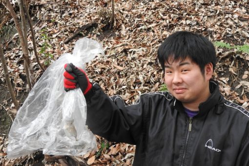 話が長くなりました。さて、今回はネズミの調査です。学生たちは山の斜面に等間隔になるようにトラップを置いていきます。ネズミの気持ちを考え、ネズミならばどのような場所を行き来するのかを想像しながら、トラップを仕掛けます。