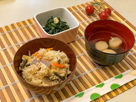 こちらはわらびを使った「炊き込みご飯」「お吸い物」「おひたし」です。