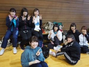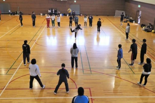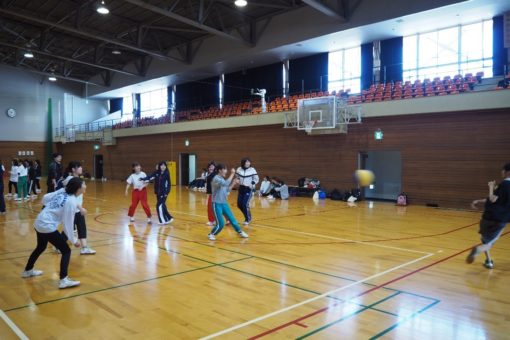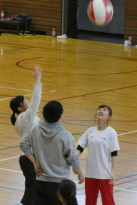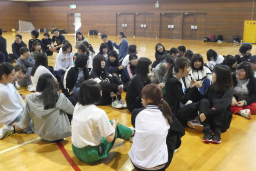 体育館に集合後、さっそくクジで学年混合の5チームに分かれて自己紹介をしたり、準備体操をしたりしながらコンディションを整え、