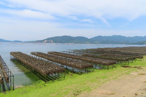 最後に、江田島のサンプリング地点の周辺から見た瀬戸内海と牡蠣いかだの写真です。瀬戸内海島嶼でのフィールド調査は、こういった美しい瀬戸内の里山と里海の景観を楽しむことができるのも醍醐味です。さぁ、こんなことに興味を持ち始めた高校生の皆さんは、生物工学科のオープンキャンパスにGOです。