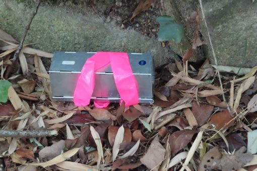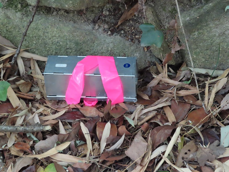 ネズミのトラップ120台を仕掛けると共に、虫を採集し、DNA実験のためのサンプルを集めました。ネズミのトラップは設置した場所の地図を書き、あとで見つけやすいように蛍光ピンクのサインテープを近くの木に巻き付けます。これをしないとよく紛失してしまうのです(1台3000円。。。)。思い思いにネズミがいそうな場所にトラップを仕掛けます。