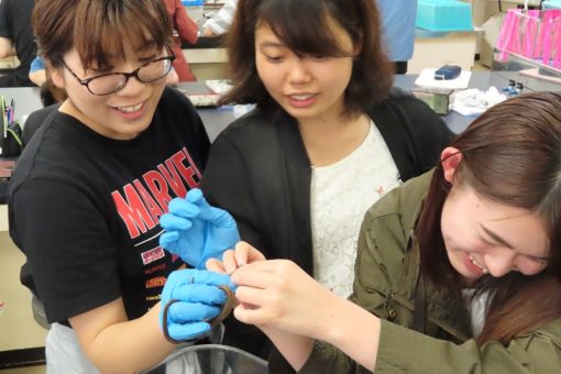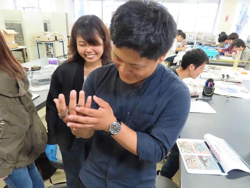 「かわいい」という声がたくさん出てくるのがこの生物工学科。みんなでその筋肉の伸び縮みの仕方や力の入り加減、口の開け方など、まじまじと観察していました。今年も野生の生き物とたくさん触れ合うことができました。まずは、ケガもなく無事にフィールド調査を終えることができ、一安心です。さて、来週からはこれらの生き物のDNA実験です。頑張りましょう。