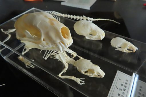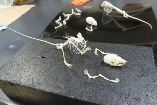 講義・実習に忙しい生物工学科の学生さんたち。1週間に一度しか集まれないけれども、ちゃくちゃくと骨格標本の作製が進んでいます。「ホネ部」的な活動になっています。下の写真は、上段左からスカンク、ニホンイタチ、アカネズミ、下段は実験モデルの商品として売られているラットの骨格標本です。商品と同レベルの標本を作ることができるようになりました。大きさからいうと、ニホンイタチとラットが近そうに思われるかもしれませんが、進化的に近縁なのはスカンクとニホンイタチ、そしてアカネズミとラットです。歯を見るとよくわかります。