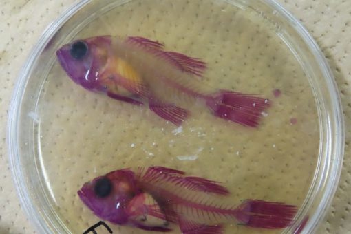 魚の透明標本グループも進んでいます(下の写真)。きれいに骨の構造が分かりますね。この1か月で、カエル、鳥、ヘビも集まり、脊椎動物の骨の進化を見ることができそうです。現在、ニホンテンの骨格標本を作製中。実験台では次にチョウセンイタチが待っています。ますます比較が面白くなってきました。ただ、もっと骨を詳しく観察したいのですが、学術標本なので壊れたらたいへん。3Dプリンタでプリントアウトできないかなぁ。。。と思っています。そしたらみんな気軽に触れる!