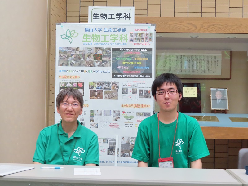 生物工学科の第1回オープンキャンパスにお越しいただきありがとうございました。テーマは バイオ X 人と自然が共存する社会へ で、学科長である岩本教授が口火を切りました。岩本教授の研究室の産業バイオテクノロジー研究室の4年生の皆さんも活躍しました。