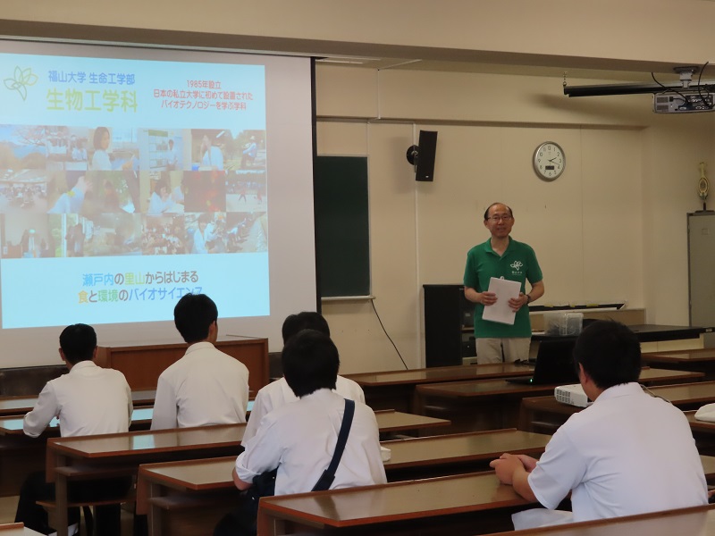 最初の学科紹介と模擬講義では、生物工学科ではどのような教育や研究を行っているのか、福山が位置する瀬戸内の中央部がいかに里山と里海の学ぶ上で適しているのか、SDGs、海洋プラスチック問題など最近の環境問題、社会目標に触れながら、バイオテクノロジーの可能性を説明しました。つまり、生物工学科のスタイルは「生き物をよく理解して、その働きを私たちの住む社会、そしてそれを支える自然環境の保全に役立てよう」ってことなんですね。