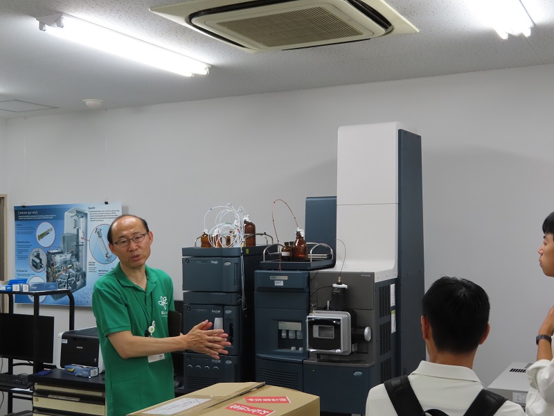 その後、グリーンサイエンス研究センターに移動し、質量分析計や新型のDNAシークエンサーである次世代シークエンサーなどの先端バイオ機器の見学を通して、最先端のバイオテクノロジー研究を紹介しました。バイオ機器紹介の後は、産業バイオテクノロジー研究室の4年生が、大学生活や講義・実習、教員免許などに関する高校生の素朴な疑問にお答えしました。