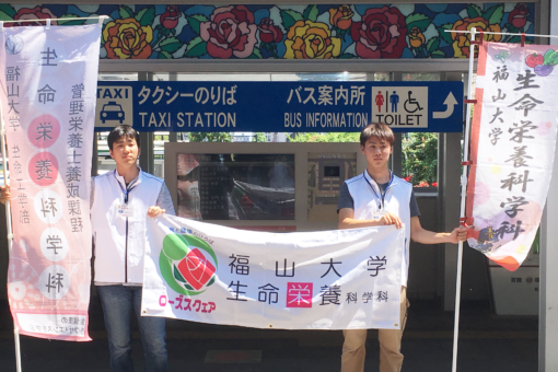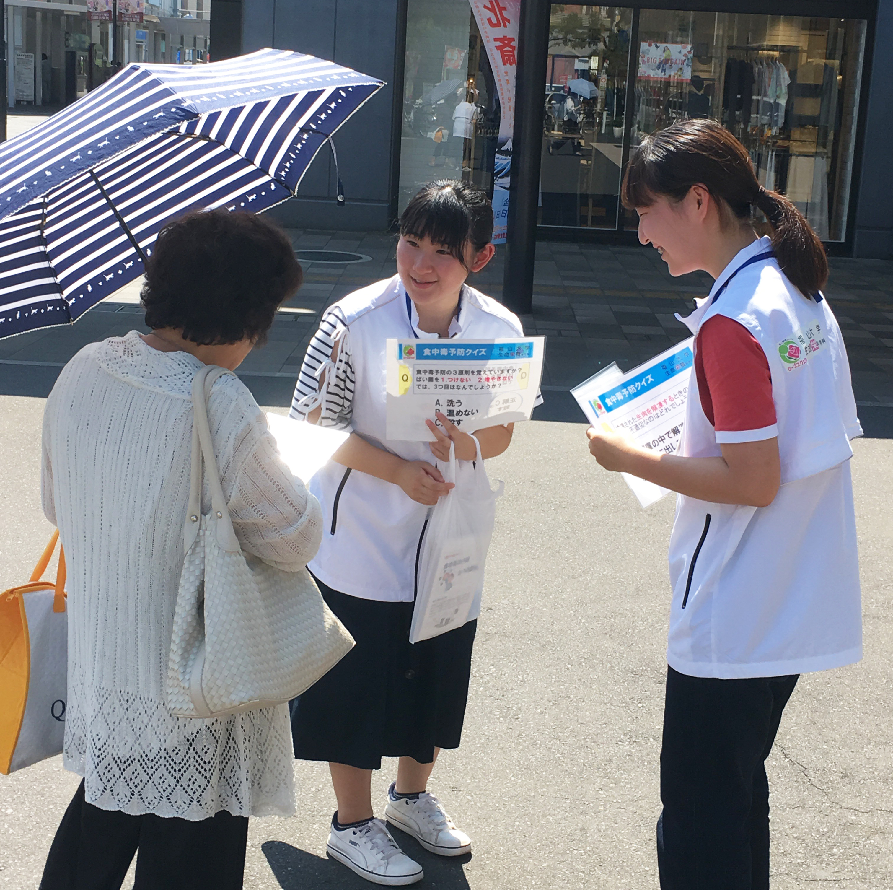7月26日(金)14時、良く晴れた炎天下の中でしたが、生命栄養科学科1年生16名が福山駅周辺にて、「食中毒予防クイズ」の出題と、予防情報が記載されている「食中毒予防リーフレット」の配付をしました。