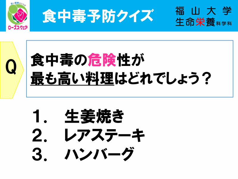 ①薄い肉をよく焼く生姜焼きは、食中毒になりにくいです。