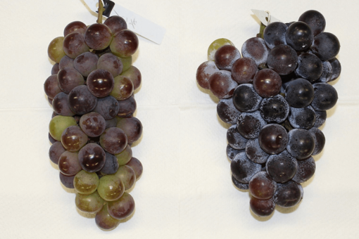 ブドウや赤ワインの色はアントシアニンという色素が大きく関わっています。私たちは寒暖差が少ない条件でも着色の良い(アントシアニンが豊富な)マスカット・ベーリーAの栽培方法を検討して、写真のように本来の黒さに近いブドウを収穫できることを示しました。また、ブドウの着色によらずより赤色の強いワインを造る醸造方法などの研究も進めています。
