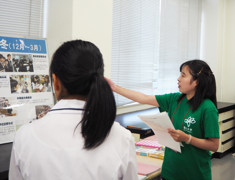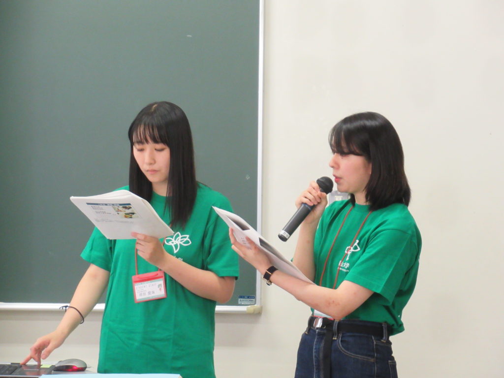 学生からは、具体的にどういった内容を授業で学んでいるのか、実験・実習の話や学生生活について、実体験を交えながら紹介しました。