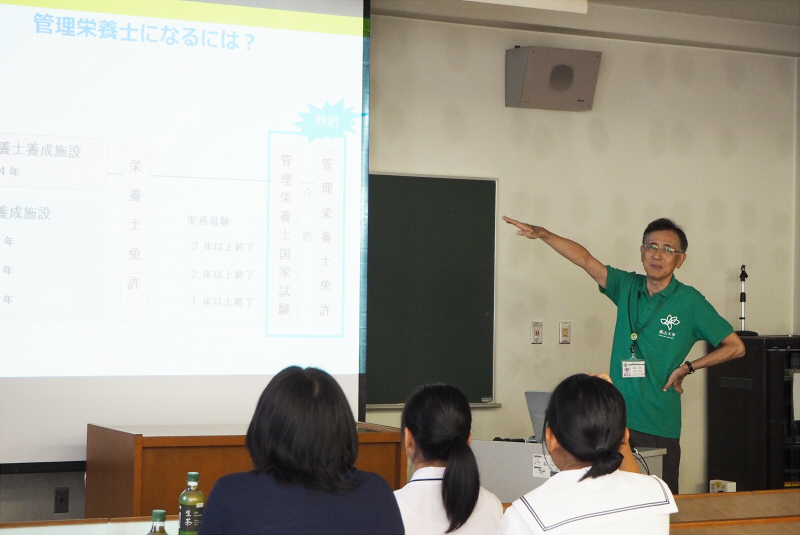 教員からは管理栄養士という職業の特徴や、社会における活躍の場から始まり、学科の学びの内容等を紹介しました。