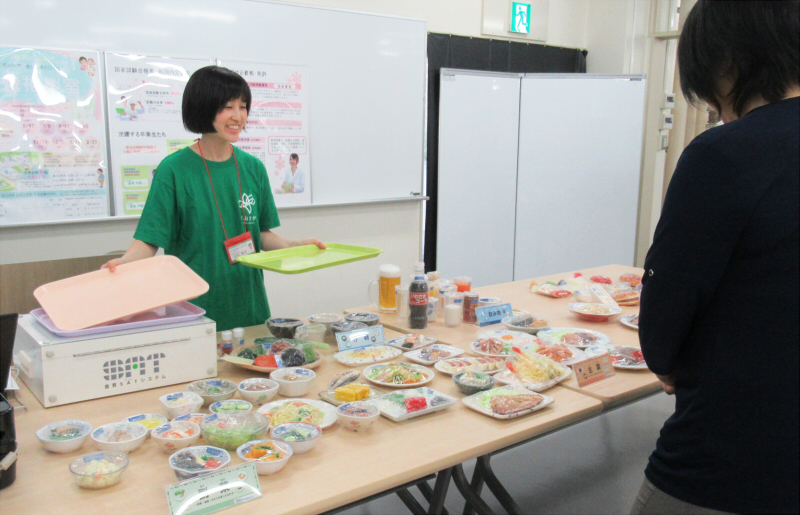 体験コーナーでは、簡単に測れる骨密度測定、筋肉量や水分量などが測れる体組成測定や、様々な食品サンプルを自由に選んで、食事バランスチェックする食育SATシステム体験を行いました。