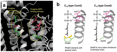 a) ホモロジーモデリングで構築したC10型ComQの触媒中心の構造