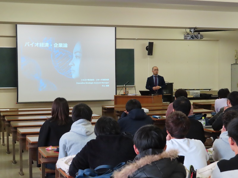 バイオの世界では誰もが知るDNAシークエンサーのメーカーであるイルミナ株式会社でリサーチ営業本部 エグゼクティブストラテジックアカウントマネージャーとして務められている井上忠雄さんの講義が生物工学科で行われました(3年次生対象:バイオ経済・企業論)。イルミナ株式会社は本学にも設置されている次世代シークエンサーMiSeqのメーカーで、今、バイオ分野の中でとても勢いのある企業です。