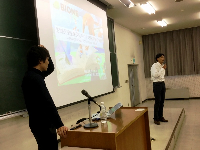講演の最後に、いかにしてここに至ったのか!という会社のパーソナルヒストリーについてもお話しいただきました。学生だった頃、何をして良いのかわからず色々なセミナーや講座に潜り込んで勉強し、アプリなら何とかなるという感触を捕まれたそうです。当時はプログラミングの知識もなく、全て独学でプログラミングやAIを学び、金もないので奨学金をつぎ込み、架空のアプリ画面を作って投資家を回って出資金を募り、嫌がる後輩を無理やり説得して会社に引き込んだりと、波瀾万丈の社史でした。このような熱意はどこから来るのか詳しくはわかりませんでしたが、熱いバイタリティーに触発された学生さんもいたことでしょう(教員も)。藤木さんとは今後も連絡を取り合って連携していくつもりなので、ぜひ生き物界のGoogleを実現して頂きたいと思います。