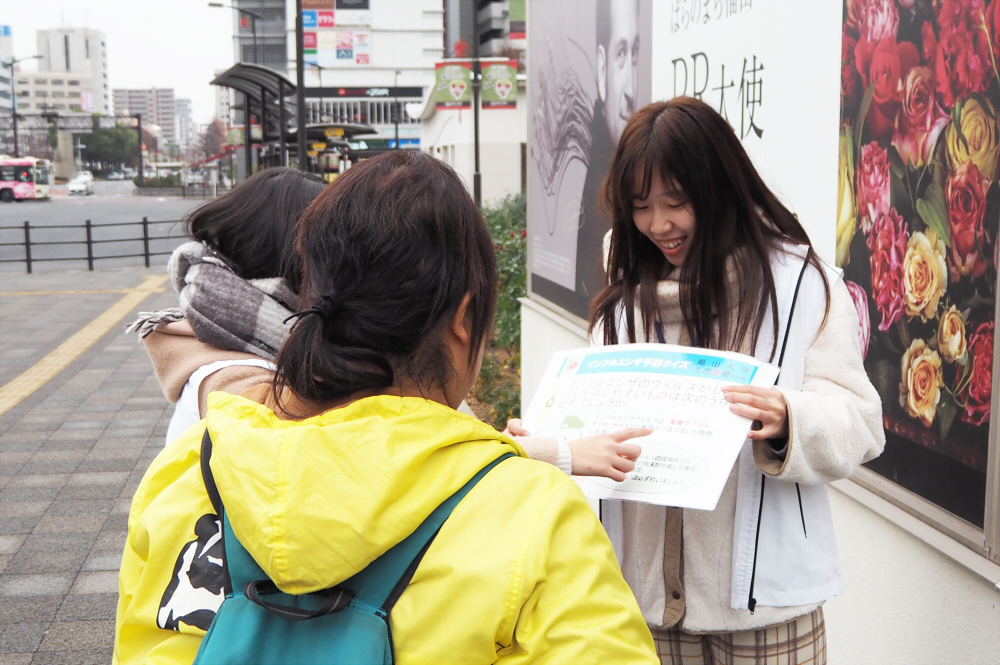 12月19日(木)14時より、生命栄養科学科1年生18名が福山駅周辺で、「インフル予防クイズ」の出題と、予防情報が記載されている「インフルエンザ予防リーフレット」と個包装のマスクをお付けし、配付しました。