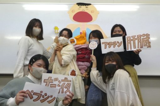 幅広い年代を対象に、口から入った食べ物が体内でどのように消化・吸収されるかを紹介しました。クイズもあり、楽しい動画です。人体模型の「まるくん」は、Aチームメンバーの力作です。